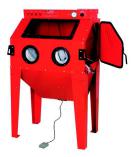 Cabina chorreadora para trabajos de mediana importancia con aspirador. Guantes de trabajo en látex de gran calidad, conectados firmemente a la carcasa. Cubierta con visor y protector pegado para una
