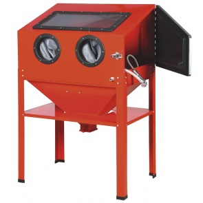 Para usar con bases de cristal, arena de sílice, óxido de aluminio, etc. La cabina de acero, dispone de una puerta superior plástica y transparente que ayuda a mantener seco el material