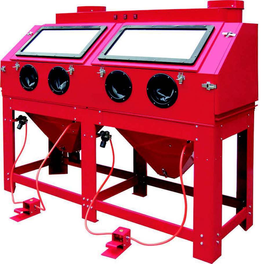 provista de sistema de aspiración y dos pistolas independientes que pueden trabajar simultáneamente con diferentes tipos de abrasivos con su propia bandeja y sistema de drenaje así
